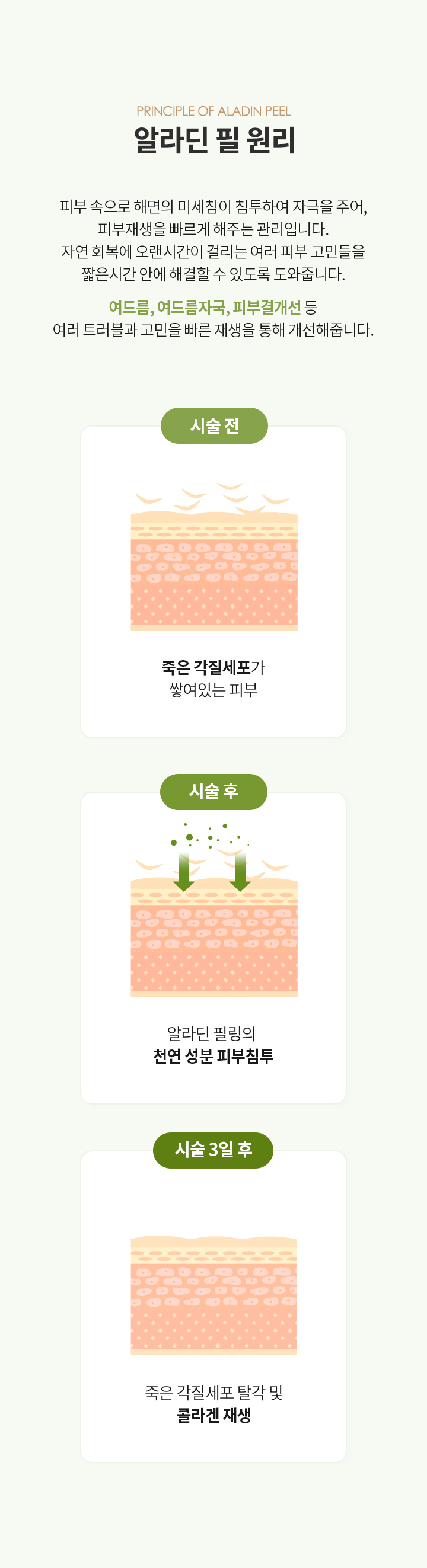 1 시술 후 5~10일에 걸쳐 각질이 자연탈각되면서 피부결이 개선되는 효과가 나타나게되며,3~4주 간격으로 3회 이상의 시술을 통해 효과를 볼 수 있습니다.