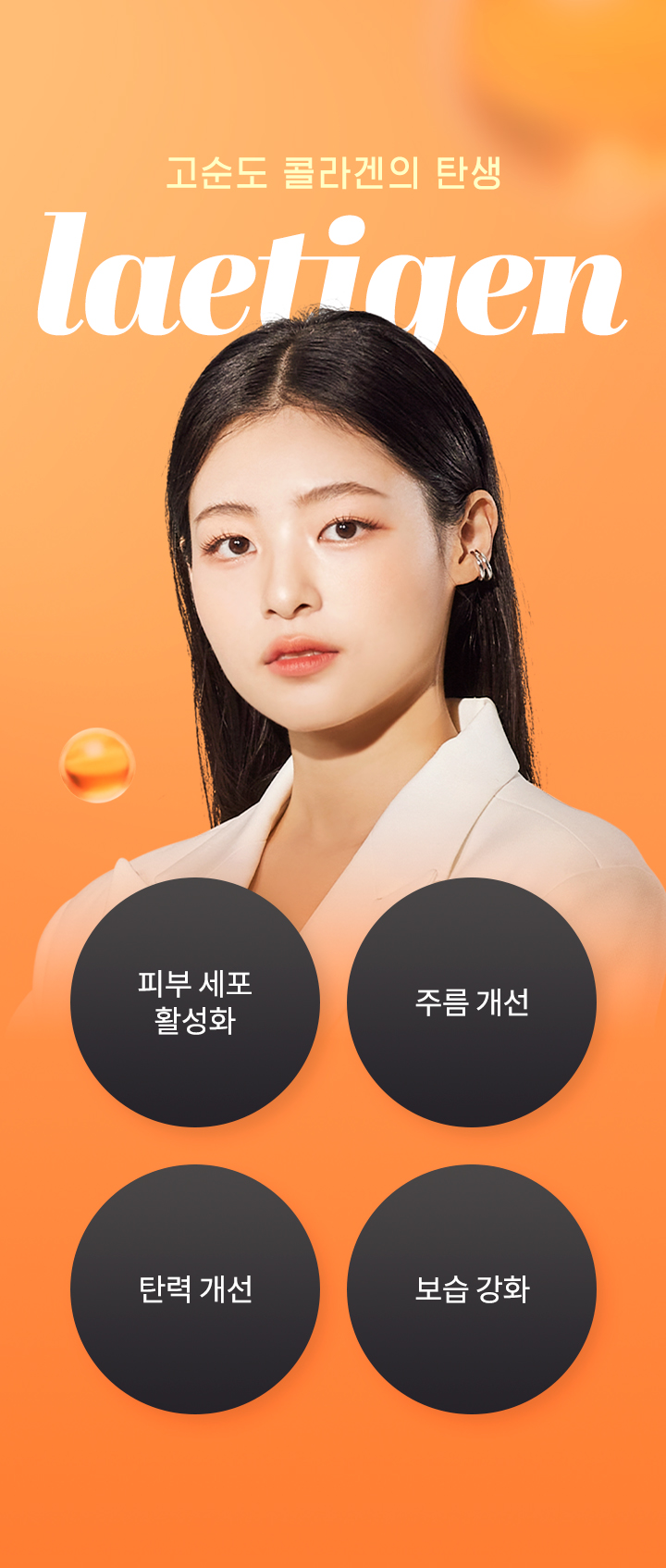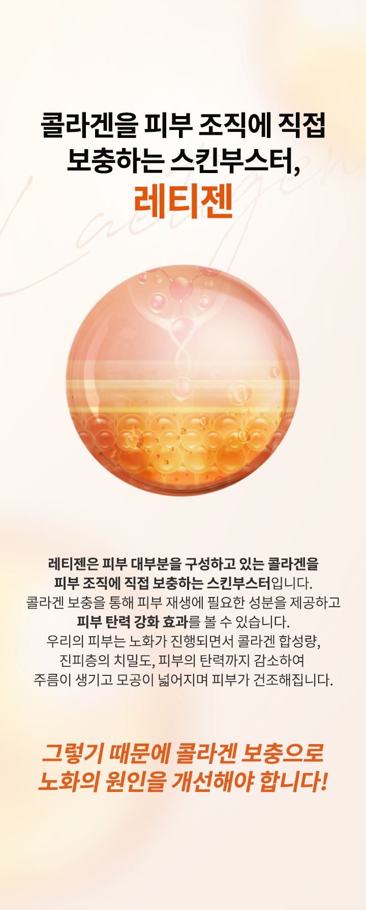 1 피부의 주요 구성 성분인 콜라겐을 직접 보충하여, 처진 피부를 탄력 있게 만들어 줍니다.