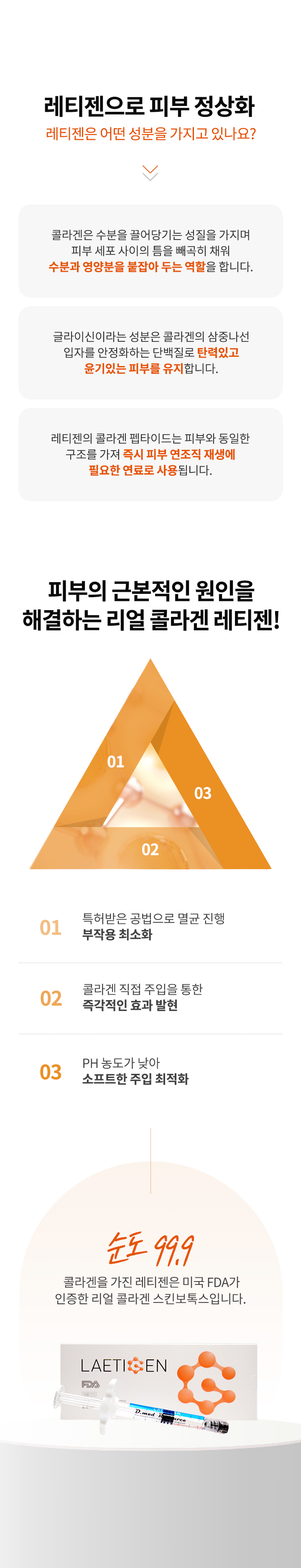 20대 중반부터 피부 속 콜라겐은 외부자극과 노화로 감소하여 잔주름이 발생하고 진피 두께와 탄력이 저하됩니다. 섭취하거나 바르는 콜라겐은 대부분 소실되어 피부에 부족한 콜라겐을 직접적으로 보충하기 어렵습니다. 피부에 직접 주입하는 순도 99.9% 콜라겐을 경험해보세요. 콜라겐(99.9%)을 피부에 직접 주사해서 모공 축소 / 유수분 밸런스 조절 / 피부 탄력 / 피부결 개선 / 잔주름 개선 피부 탄력의 효과가 있습니다.